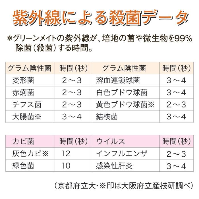 業務用として誕生した空気除菌脱臭器「グリーンメイト」は、純粋オゾンと紫外線の力で空気中の浮游雑菌やウイルスを除菌・溶菌する、強力な空気除菌・脱臭器です。殺菌後は炭酸ガスと水になるので、人体に害を与える恐れは無く、抵抗力が低下している方が多く集まる病院には、まさに最適だと言えます。本来、病院や店舗、ホテルや介護施設などでの使用目的に開発されたものが、大注目を浴びています。それは、何と言っても、その優れた性能。12種類もの菌や微生物、それにインフルエンザなどのウイルス菌に対して驚異的な効果(京都府立大及び大阪府立産業技術総合研究所調べ)が認められてます。